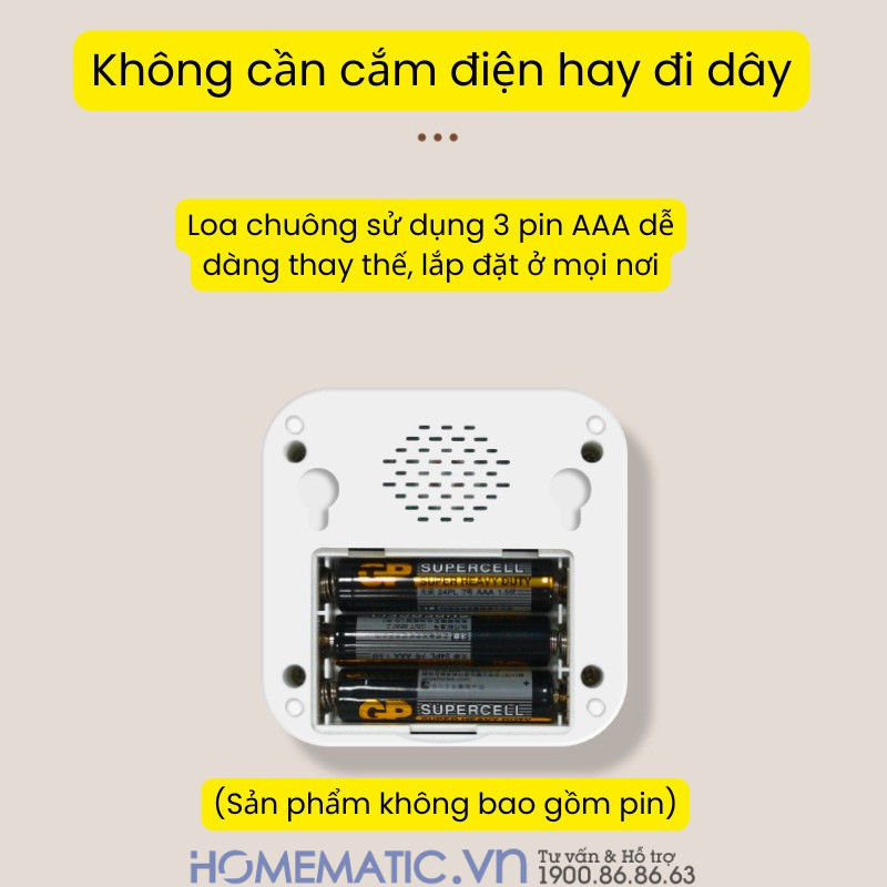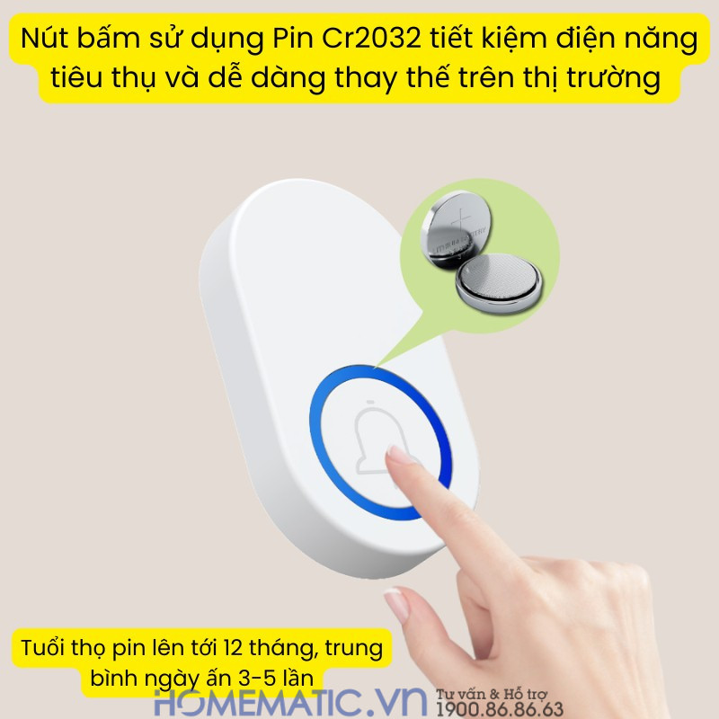 Tiết kiệm năng lượng: Nút bấm sử dụng pin với thời gian chờ lên đến 1 năm, loa chuông dùng 3 pin AAA hoặc pin sạc(vui lòng lựa chọn và xem giá), giúp bạn yên tâm sử dụng lâu dài mà không lo thay pin thường xuyên.